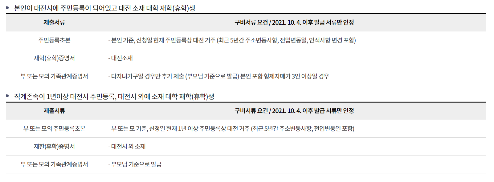 - 신청인의 직계존속이 신청일 현재 1년 이상 대전광역시에 주민등록이 되어있고, 대전시 외에 소재한 대학에 재학 중인 자(휴학생 포함)