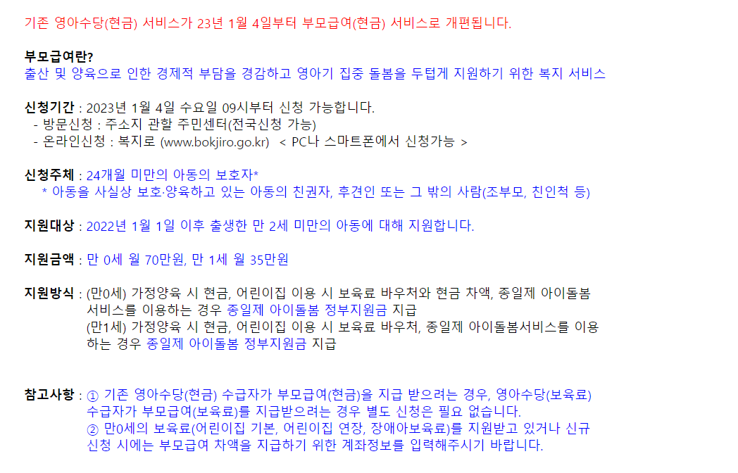 2) 2022년 12월에 영아수당(현금 월 30만 원 또는 보육료)을 받고 있었다면 부모급여를 새롭게 신청할 필요는 없습니다. 다만, 2023년 1월 기준 만 0세(’22.2월생~’22.12월생) 아동 중 어린이집을 다니면서 보육료를 지원받고 있는 아동의 보호자는 부모급여 차액 18만 6,000원을 받기 위한 은행 계좌를 등록해야 한다.