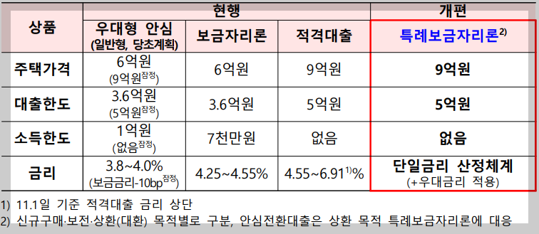 표에서 보다시피 주택가격이 9억 이하면 소득에 관계없이 모두 특례보금자리론 이용이 가능합니다. 현재 보금자리론과 비교해보면 훨씬 유리한 조건의 상품이라고 볼 수 있습니다. 게다가 대출한도도 최대 3.6억원에서 5억원으로 확대되기 때문에 한도는 늘고 금리는 낮아졌다는 것을 한 눈에 알 수 있습니다.