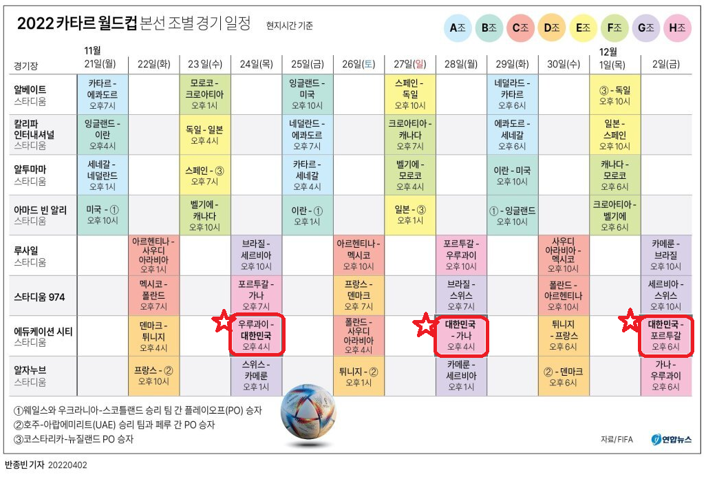 총 32팀의 축구 국가대표님이 A~H조까지 총 8조로 나뉘어지게 되구요, 12월 3일까지 조별 예선을 치루게 됩니다.