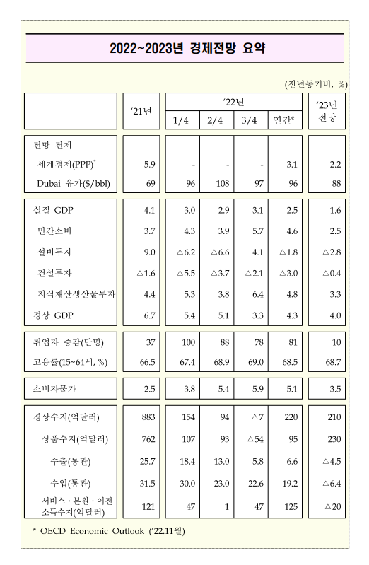 아래 표를 통해 2022년과 2023년의 상세 경제전망 내용을 비교할 수 있으며