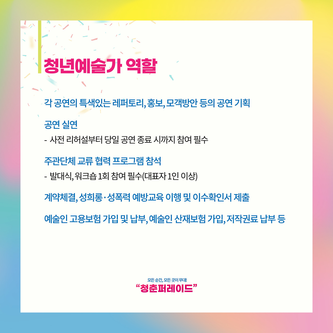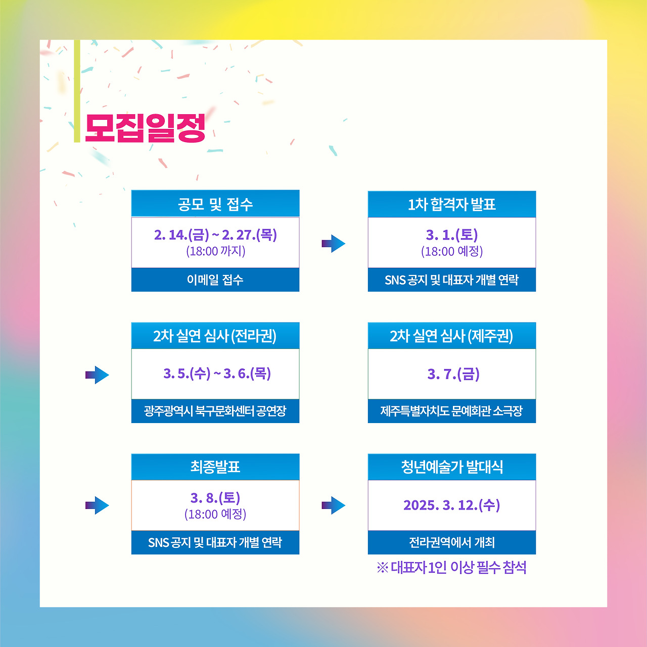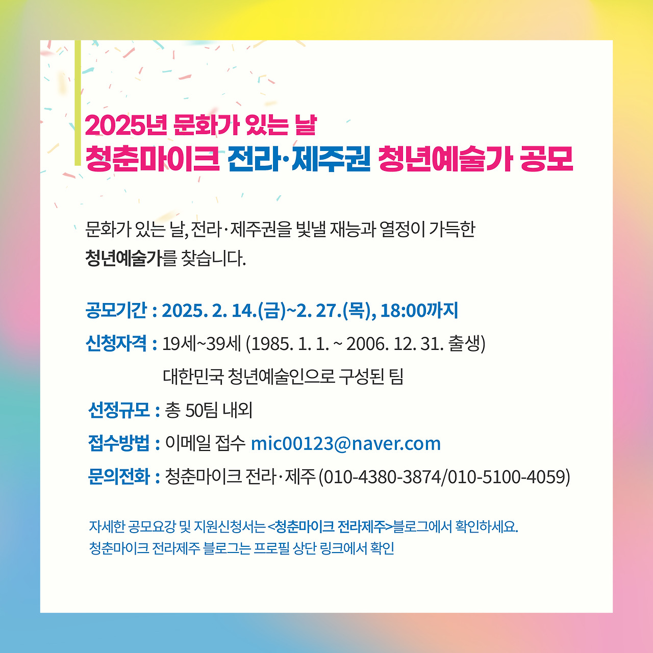 [첨부 2](명단)2025 문화가 있는 날 청춘마이크_전라·제주권 청년예술가 지원신청서 명단.xlsx 0.10MB [첨부 1](지원신청서) 2025 문화가 있는 날 청춘마이크_전라·제주권.hwp 0.08MB (공고) 2025 문화가 있는 날 청춘마이크_전라,제주권_청년예술가 공모요강.pdf 0.63MB